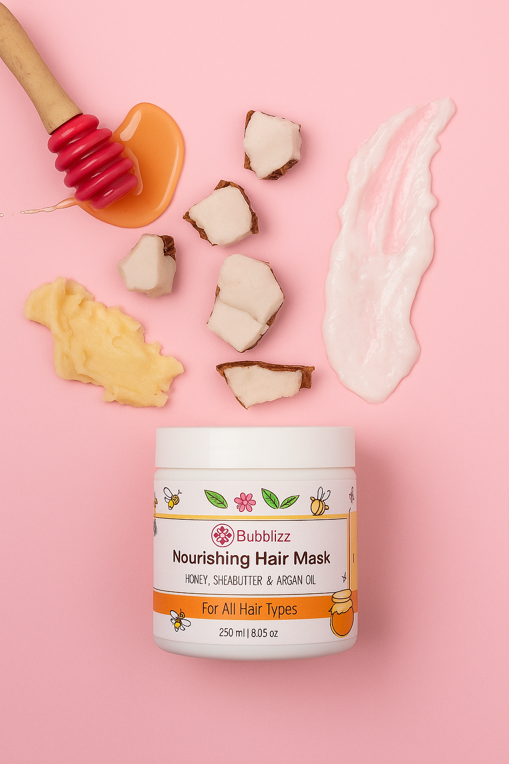 المكونات النشطة: العسل، البانثينول، زيت جوز الهند، زيت الجوجوبا، زيت الأرغان، زبدة الشيا.